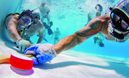 Take your breath-hold diving skills to the next level by joining your local underwater hockey team. As you might imagine, underwater hockey involves two opposing teams, sticks and a puck. It’s played with six players on each team at a time on swimming pool bottoms, typically at 7 to 9 feet deep. A 10-foot-wide goal sits on the bottom at each end of the pool. Players wear a mask, snorkel and fins as well as a water polo cap, a mouth guard and a protective glove on their striking hand. Using curved 10- to 12-inch sticks, players endeavour to outscore their opponents by striking the 3-pound rubber-coated puck, attempting to send it into the opposing team’s goal.