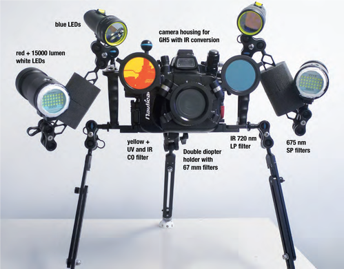 camera, housing, tripod, a longpass (LP) near-infrared filter, tricolor or blue LED dive lights, shortpass (SP) light filters and a dual diopter holder for the filters. Divers can use a much