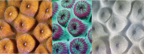 This imaging sequence of a great star coral uses, from far left, white lighting with no filter, blue LED lighting with a yellow filter, and blue lighting with a near-infrared 720 nm longpass filter. The center image shows green fluorescent proteins and red emissions from chlorophyll. The image on the right shows near-infrared chlorophyll fluorescence.