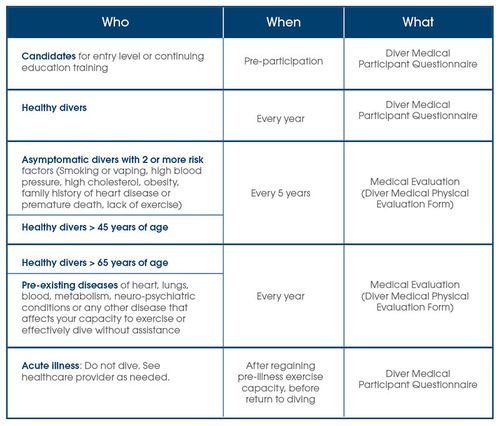 To promote divers’ medical fitness to dive throughout their lives, Divers Alert Network® (DAN®) created and published the Guidelines for Lifelong Medical Fitness to Dive. This document, which is intended to be used by divers, dive professionals and doctors, establishes a schedule for medical questionnaires and physical evaluations based on age and other relevant factors.