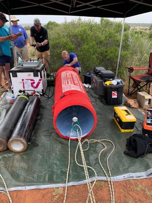 In the weeks leading up to the Boesmansgat 2021 expedition, we were alerted to the fact that the Danielskuil region had experienced extraordinary high rainfall in the preceding months. Severe flooding had occurred a few weeks prior to the trip and the water level of Boesmansgat was rising at a rate of knots. We knew that space would be limited for setting up a staging area at the water’s edge and had to revise our plan carefully. The dive team was alerted of this fact and everyone was informed that just the bare essentials would be permitted to be brought down to the bottom of the hole. Careful consideration was also given to which areas around the waters edge would be used for what purposes in order to maintain a neat and ordered dive site and operation.