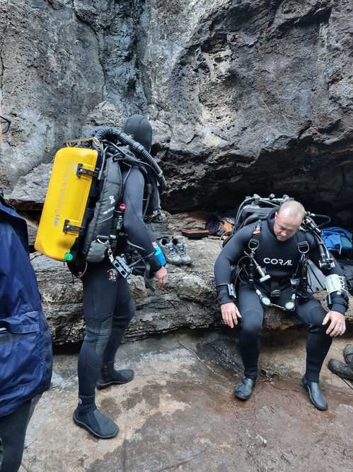 Carrying up twin cylinders each time they needed to be filled, was not going to be possible. We set up a 75m long high-pressure hose that would run from a compressor at the top of the cliff, to reach all the way to an area, which we had identified as the twinset refilling area, in a cave near the water’s edge. This worked well and we were able to fill all air cylinders without having to carry the heavy equipment back up to the top. Since this was done in a dedicated area, the possibility of a clutter of empty and full cylinders in the vicinity of the entry point into the water was avoided.