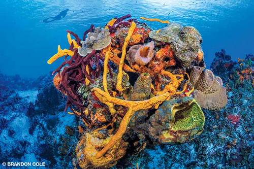 A diver swims over a coral reef bright with rainbow colors of rich sponge growth in Cozumel, Mexico.