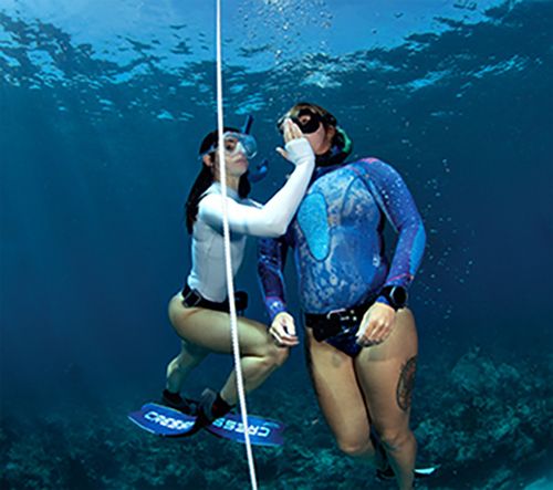 Instructor Anna Capps and freediving student Lauren Cornell enjoy a free immersion dive together after completing the certification requirements.