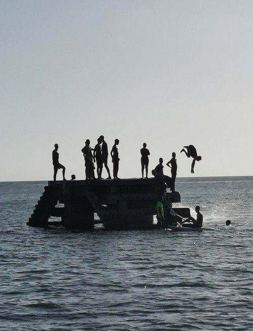 Some Inhaca youth finding afternoon entertainment between an old concrete ruin and the surrounding ocean. Photo: Shani Shepherd/Ocean Echo Scuba