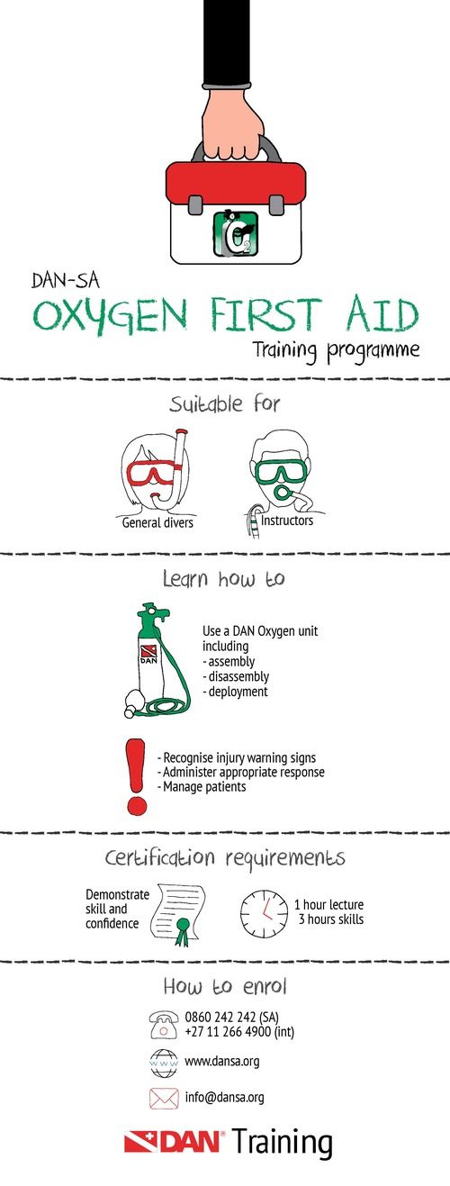 Oxygen first aid can greatly improve the chances of making a full recovery for divers with decompression illness, shock or drowning. The DAN Oxygen Provider course provides entry-level training on recognising and managing possible diving-related injuries using emergency oxygen first aid effectively.
